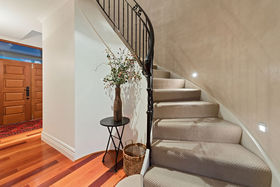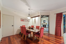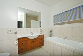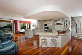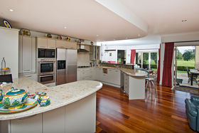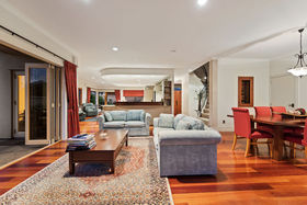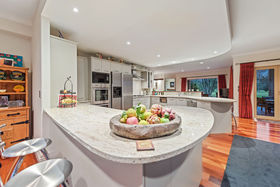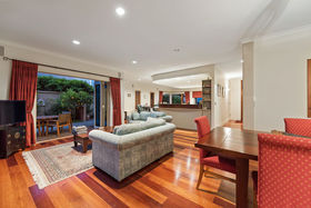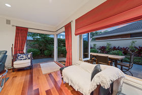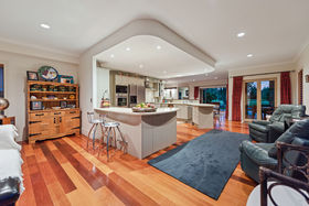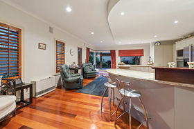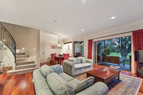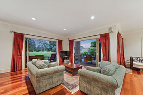Everything one has dreamt about is here to be enjoyed. Beginning downstairs with a huge open plan dining plus family room. Double doors lead to a cosy formal lounge with a gas fire and mantle piece. This room looks over the golf course. Featured in the middle living area is a very large designer kitchen, which also has views of the golfers going by. Just a step outside leads you to a private alfresco covered dining / bbq area, which is surrounded by an immaculately planted garden. After stepping back into the house we can wander outside in the other direction to a grassed paved area. Beautiful evenings can be spent here watching the sun go down. Also downstairs is a separate laundry where the washing machine and dryer will be staying as part of the chattels, there's also a separate toilet.