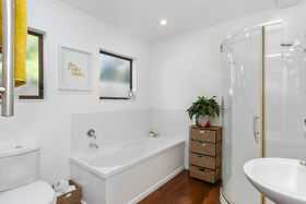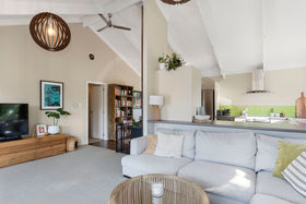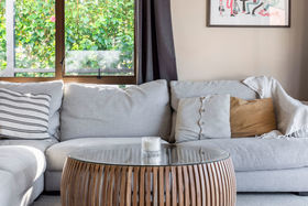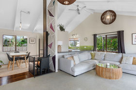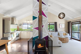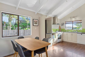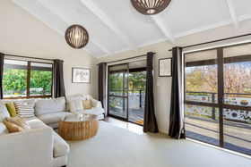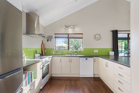 The sunny kitchen with ample bench-space and an earthy palette is the perfect place for family and friends to gather and enjoy or step out onto the north-facing deck and soak up the atmosphere and views.