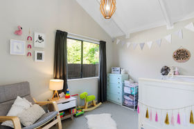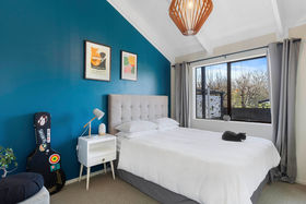 The split-level from living to bedrooms provides for separation of spaces and enhances the fireplace as a focal point of the home. The rooms are light, bright and welcome the sun throughout the day. Enjoy the view from the generously sized, contemporary master with it's own heat pump. Just across the hall you can make your way to two further bedrooms, crisp main bathroom or functional laundry which exits to the rear sunny garden.