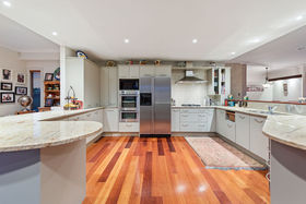 Everything one has dreamt about is here to be enjoyed. Beginning downstairs with a huge open plan dining plus family room. Double doors lead to a cosy formal lounge with a gas fire and mantle piece. This room looks over the golf course. Featured in the middle living area is a very large designer kitchen, which also has views of the golfers going by. Just a step outside leads you to a private alfresco covered dining / bbq area, which is surrounded by an immaculately planted garden. After stepping back into the house we can wander outside in the other direction to a grassed paved area. Beautiful evenings can be spent here watching the sun go down. Also downstairs is a separate laundry where the washing machine and dryer will be staying as part of the chattels, there's also a separate toilet.