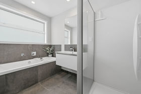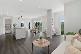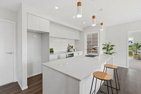 Designed with modern life in mind, the spacious open-plan heart of the home brings together the kitchen, dining and family living in one light-filled space. The high-stud ceiling and impressive triple-stacker ranch slider create fantastic indoor-outdoor flow and a bright, airy feel throughout the day.